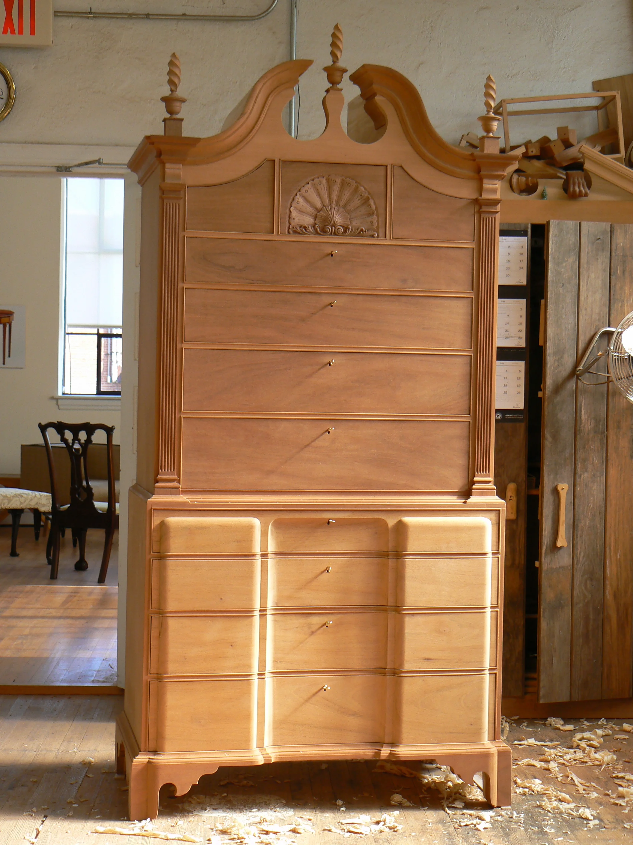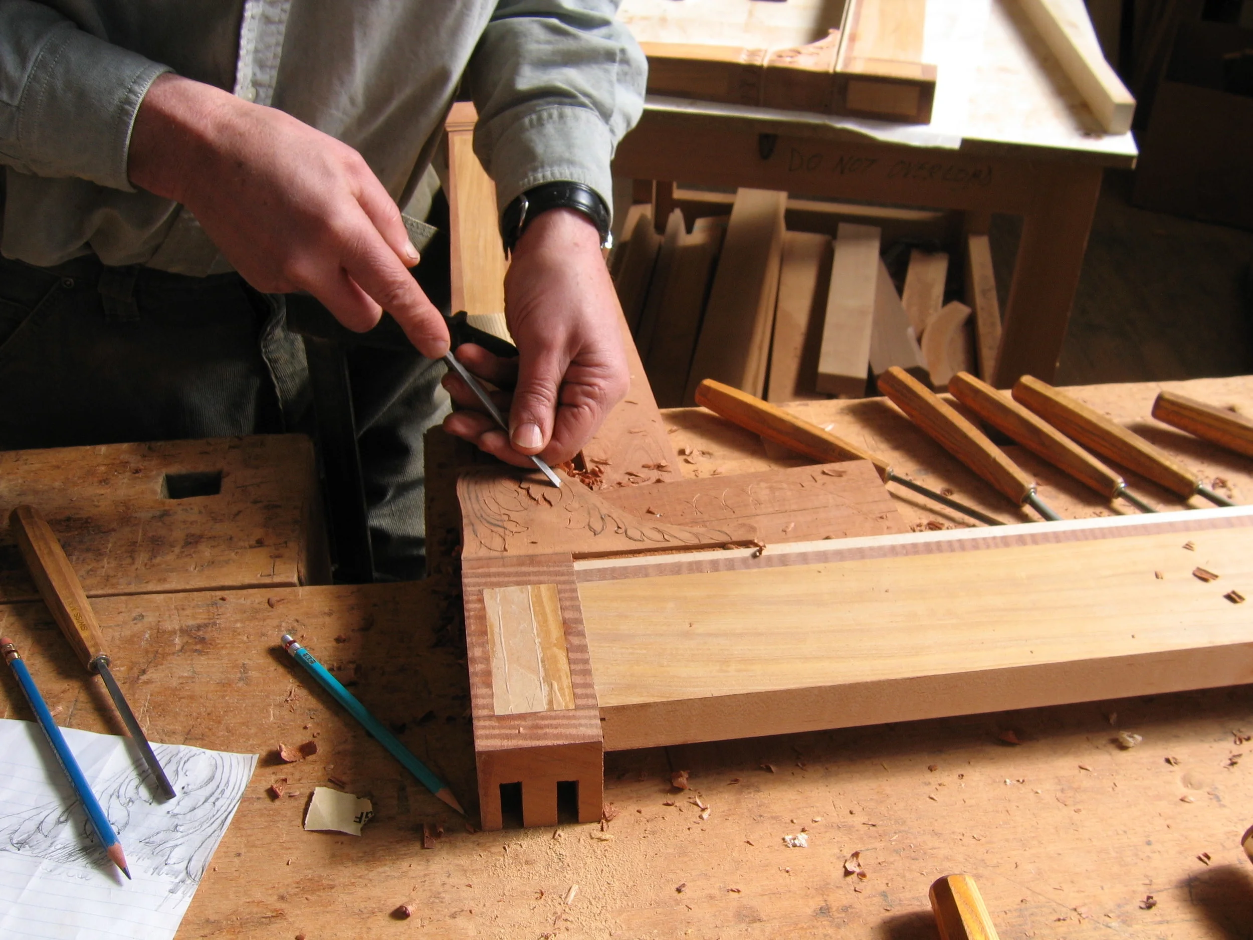 Chair to right is a copy of 18th Century chair to left. Construction and carving by Lars Gunlicks.